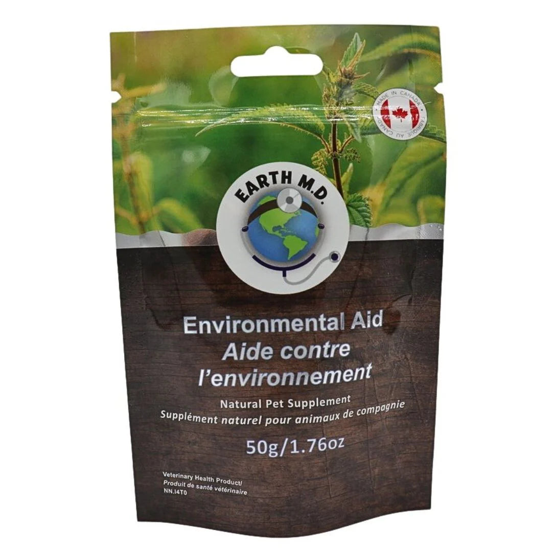 Earth MD Environmental Aid is a natural, plant-based powdered supplement formulated to support healthy skin, coat comfort, and a balanced response to everyday environmental allergens.